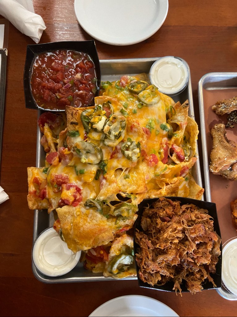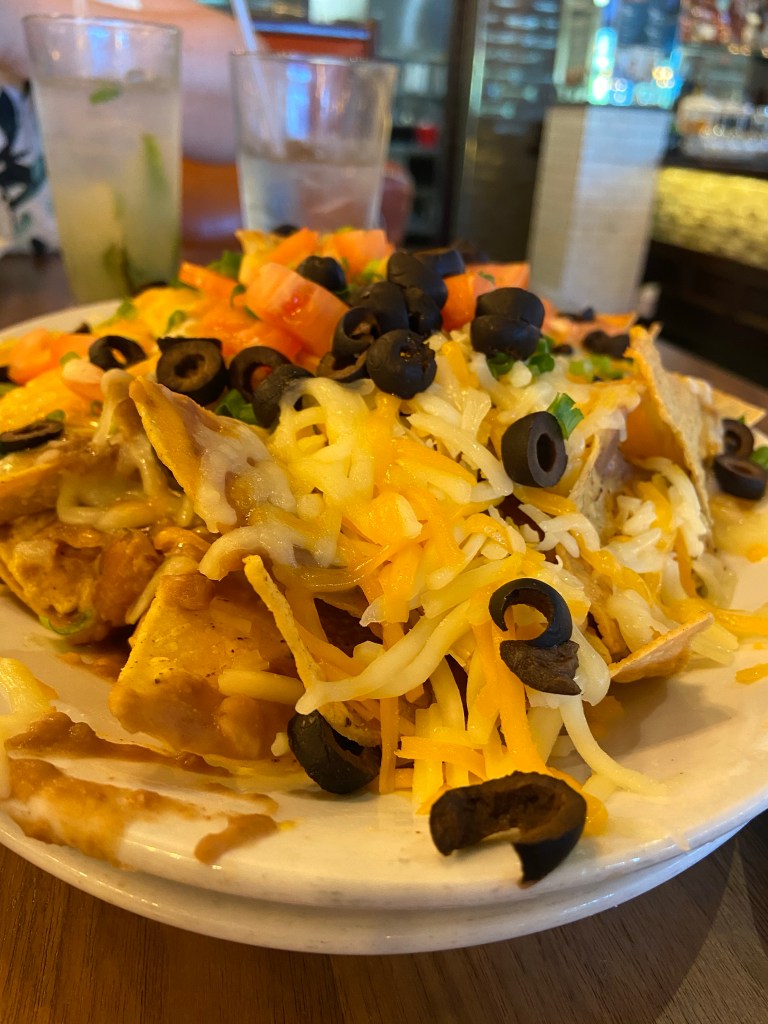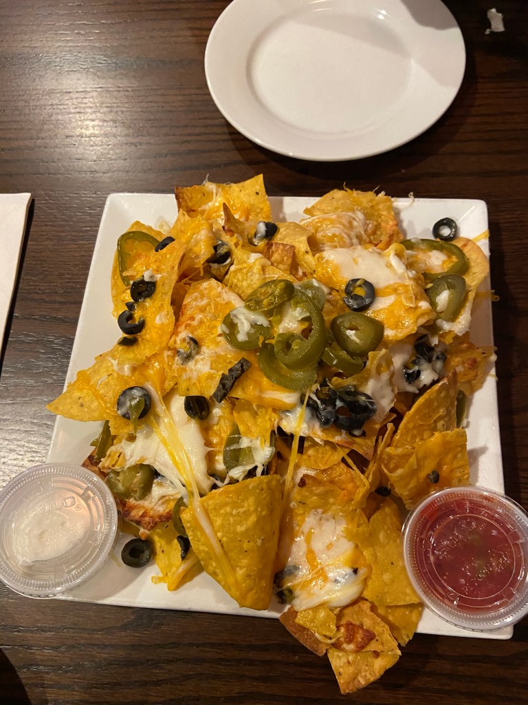 - Comments: We ordered the half with chicken which was more than enough for the two of us. However, we did not love dollop of sour cream on top of the unnecessary lettuce in the middle of the ‘chos. Lots of soggy chips which we think could be from the beans. Additionally, the toppings were not evenly distributed and the bottom layer was completely cheese-less. We did not favor the chips at all.